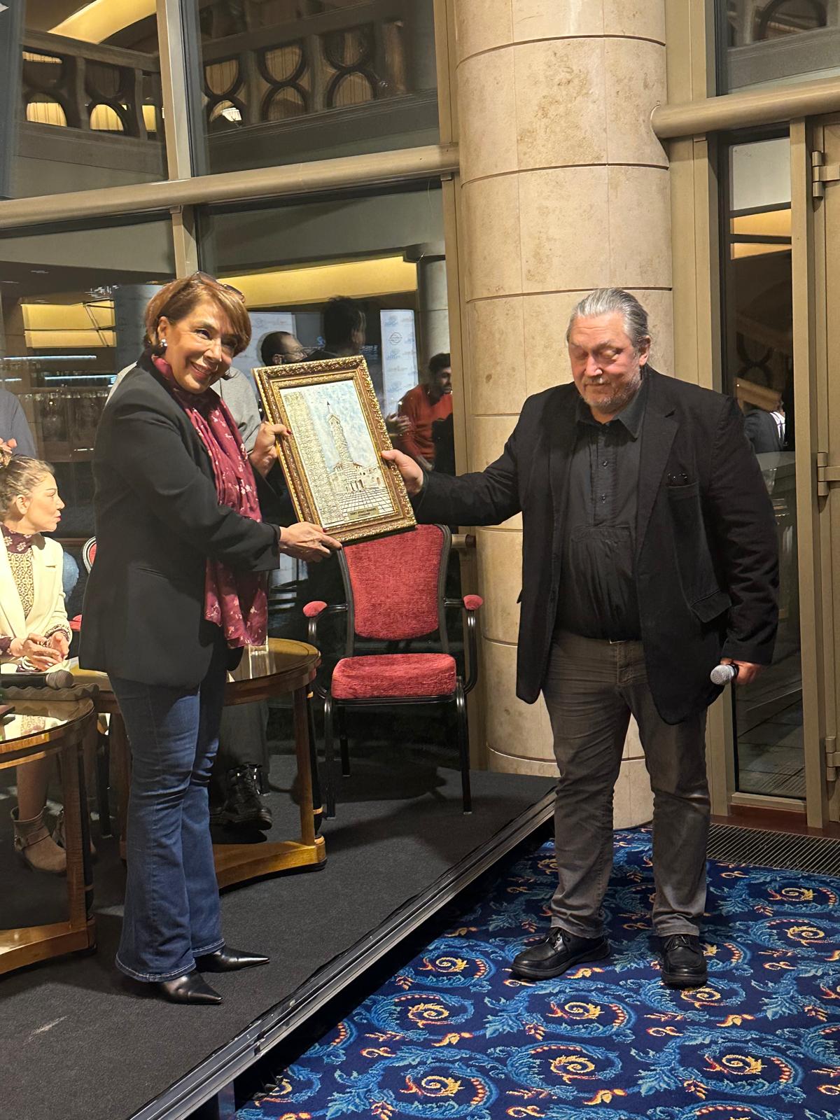 Söyleşinin sonrasında Macaristan Devlet Tiyatrosu Genel Sanat Yönetmeni Attila Vidnyánszky, Şehir Tiyatroları Genel Sanat Yönetmeni Ayşegül İşsever’e tablo takdim etti.